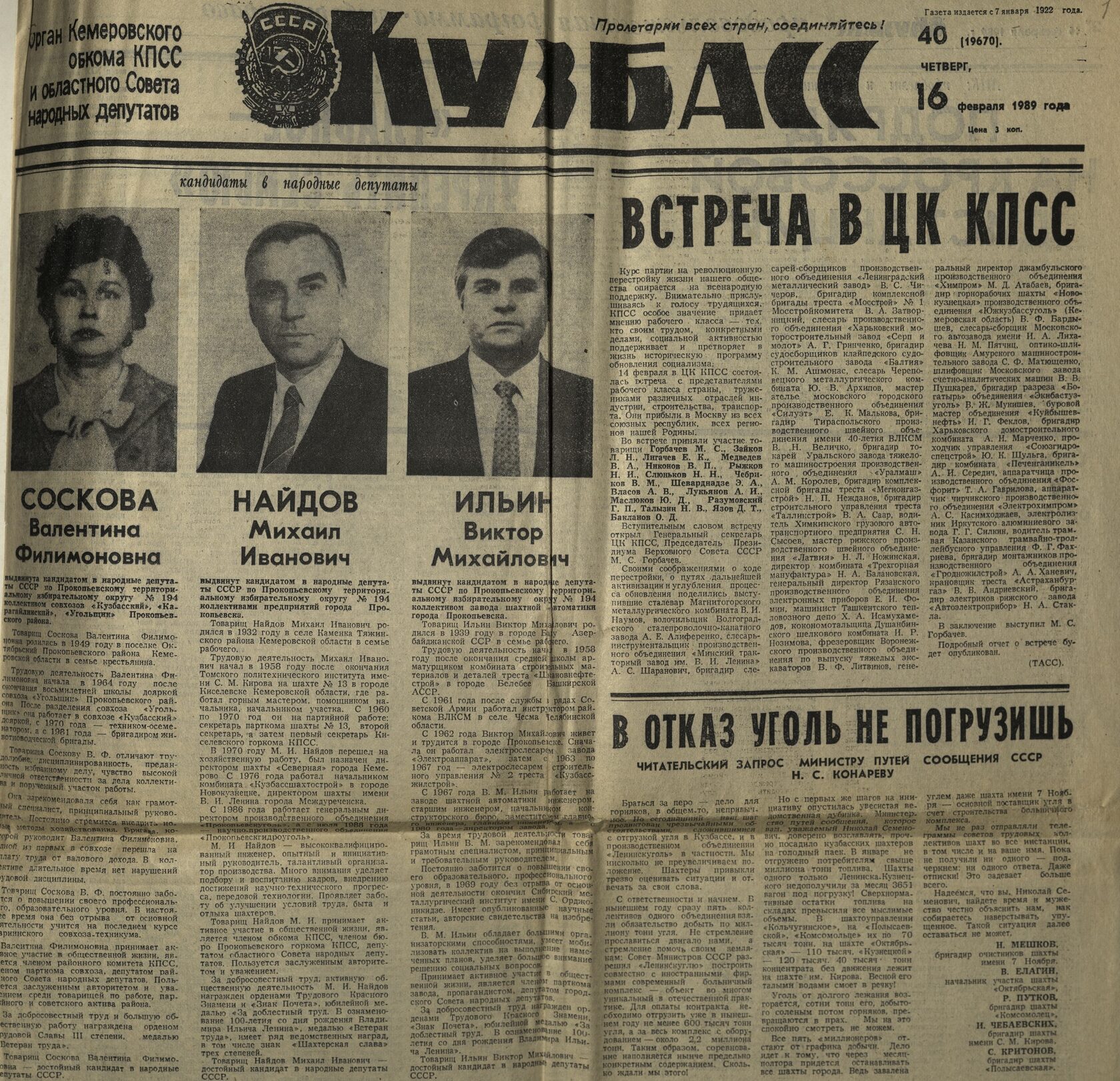 Статья «Кандидаты в народные депутаты» в газете «Кузбасс» № 40. 16.02.1989 г. // ГКУ ГАК.