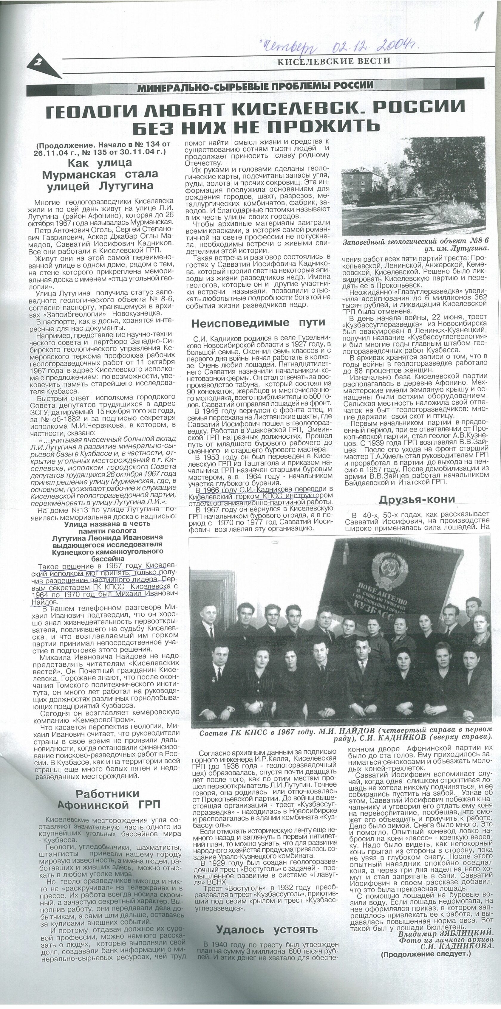 Статья «Геологи любят Киселевск. России без них не прожить» в газете «Киселевские вести».