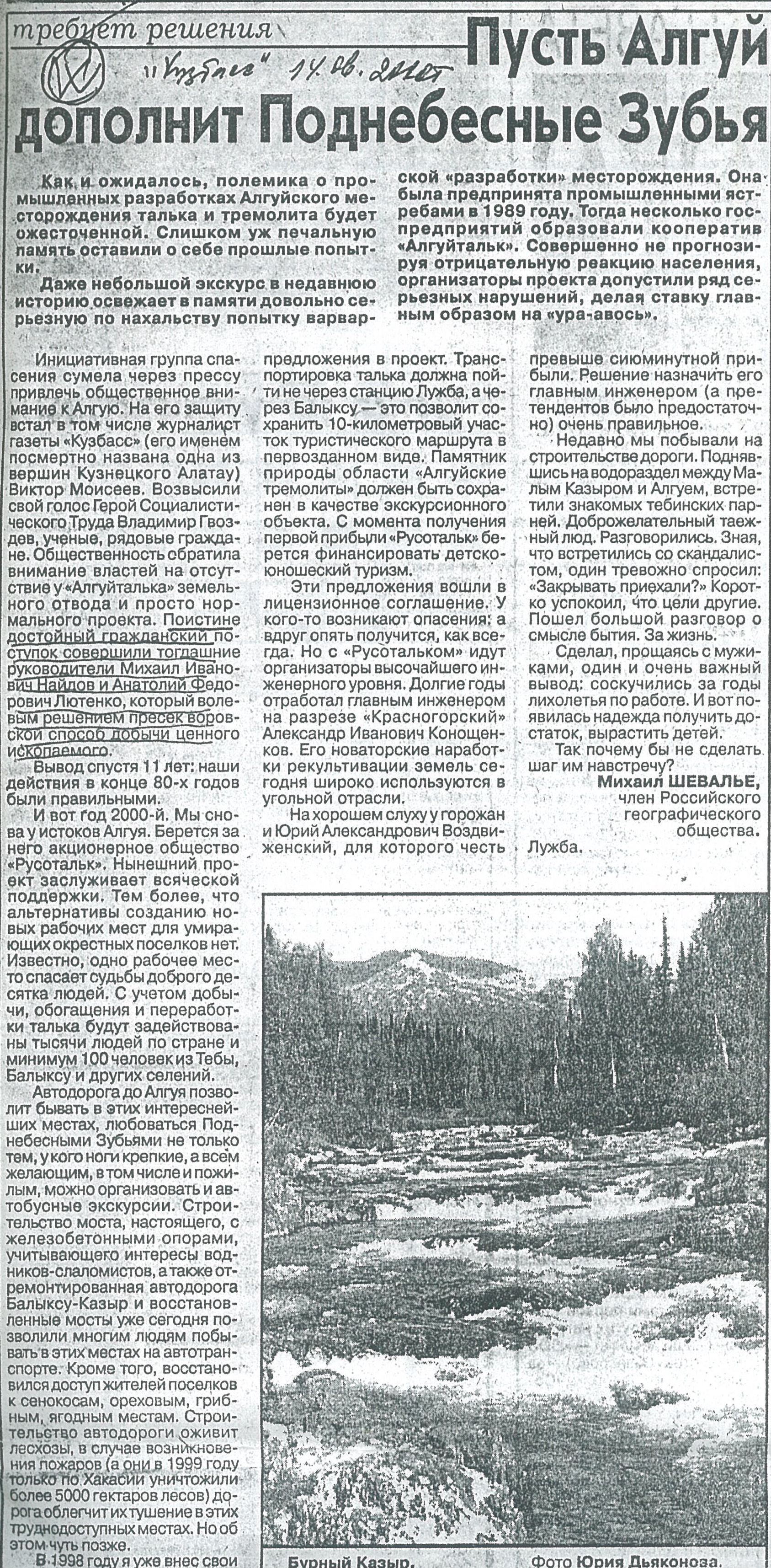 Статья «Пусть Алгуй дополнит Поднебесные Зубья» в газете «Кузбасс». 14.06.2000 г. //