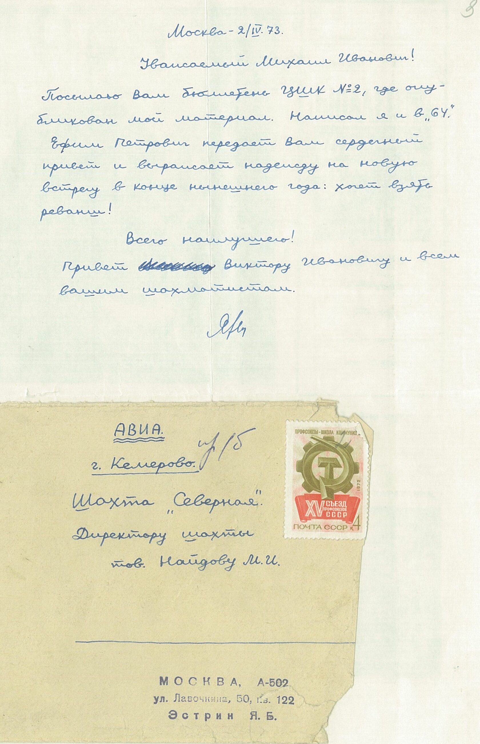 Письмо мастера спорта по шахматам Я.Б. Эстрина М.И.Найдову. 1973 г. //