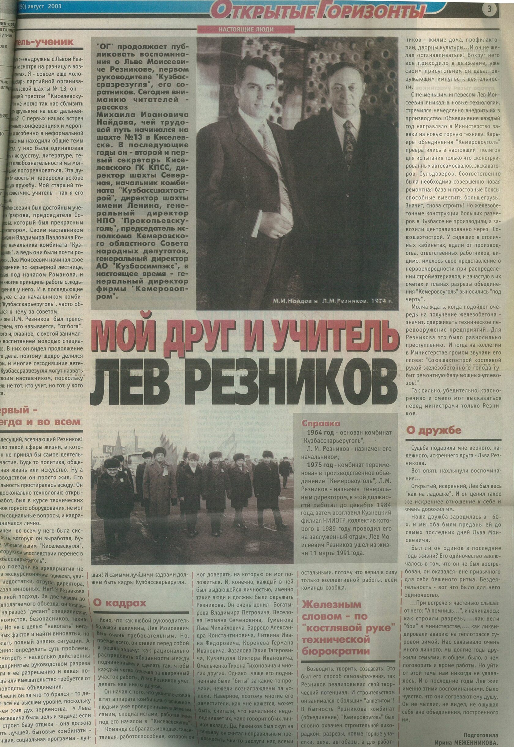 Статья «Мой друг и учитель Лев Резников» в газете «Открытые горизонты». 08.2003 г. //