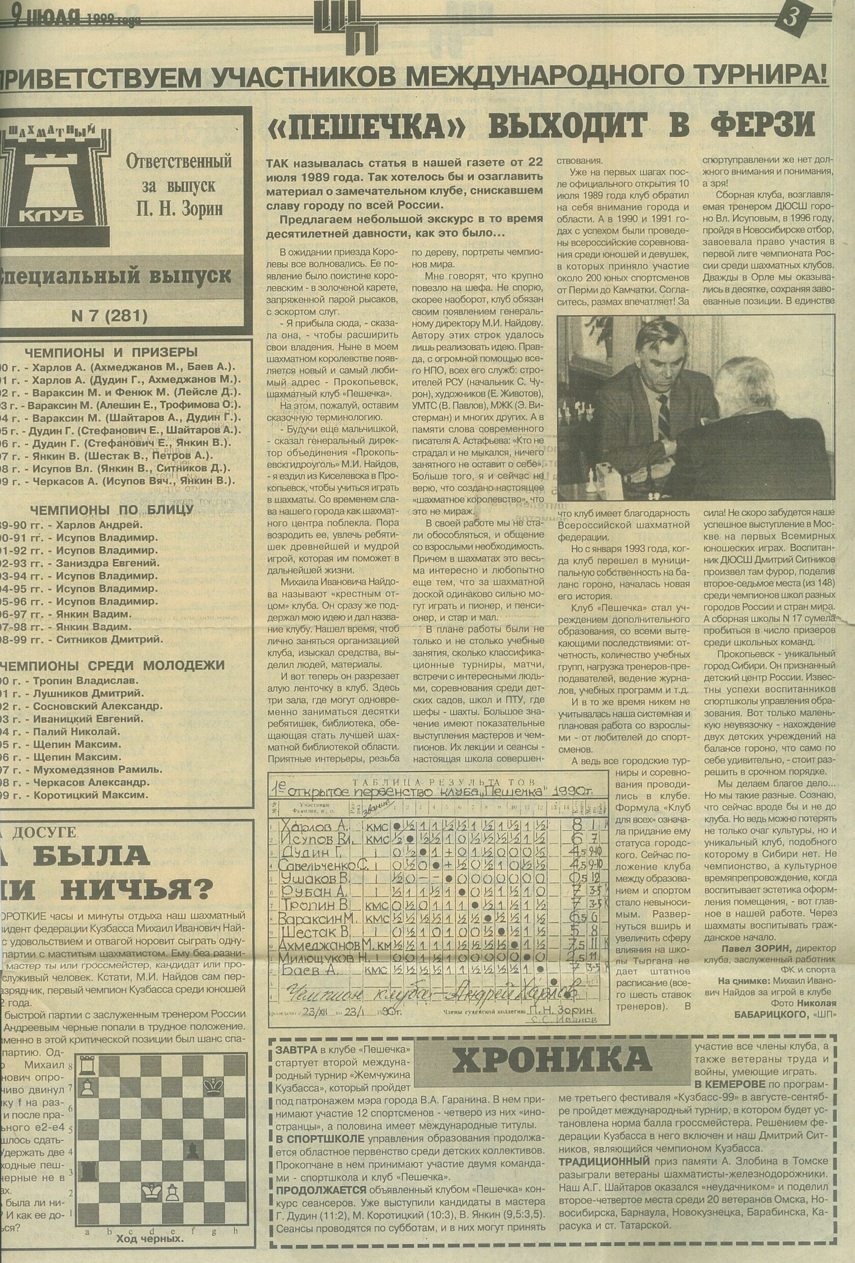 в ферзи» в газете «Шахматный клуб». № 7/ 09.07.1999 г. //